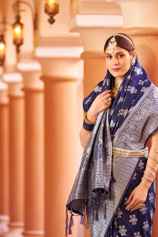 Indigo Blue Designer Banarasi Bland Soft Silk Saree with Zari Pallu