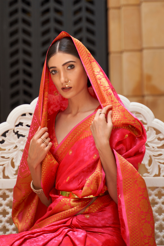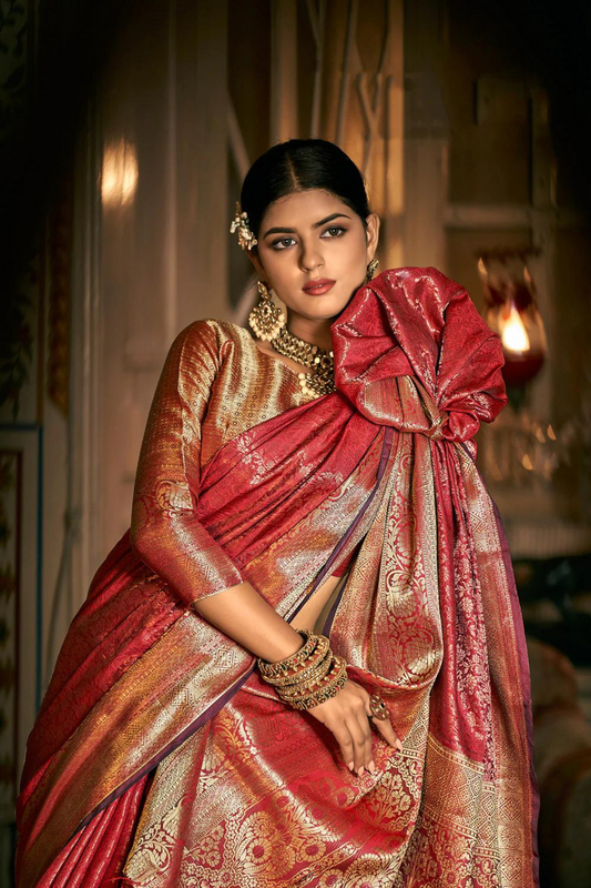 Ruby Red Pure Kanjivaram Silk with Bronze Zari Weaving