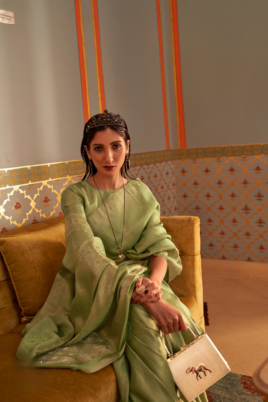 Trendy Olive Green Kanjivaram Silk Saree with Satin Weaving Work