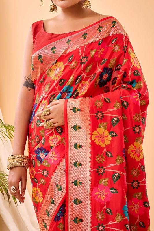 Tomato Red Paithani Silk Saree with Royal Jaal Work