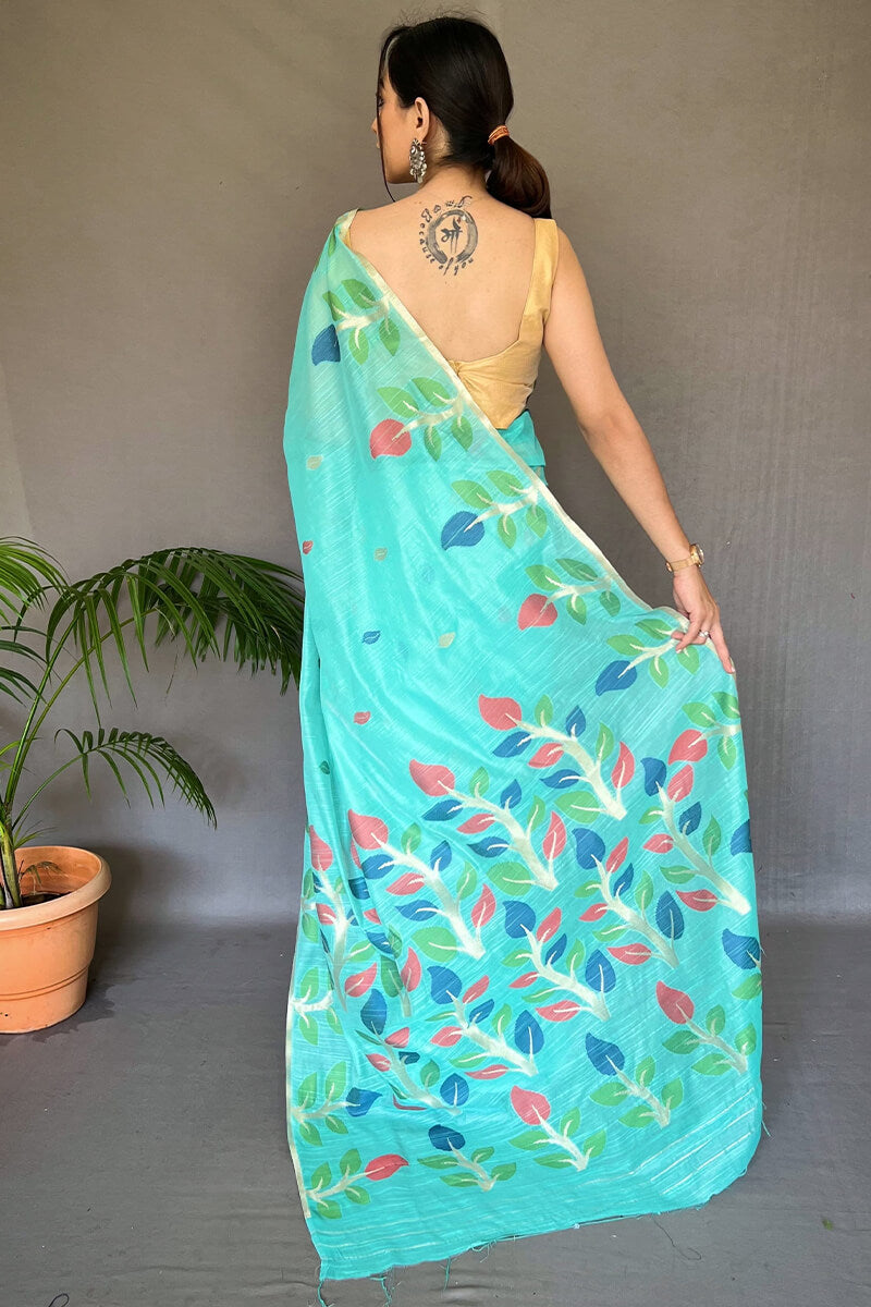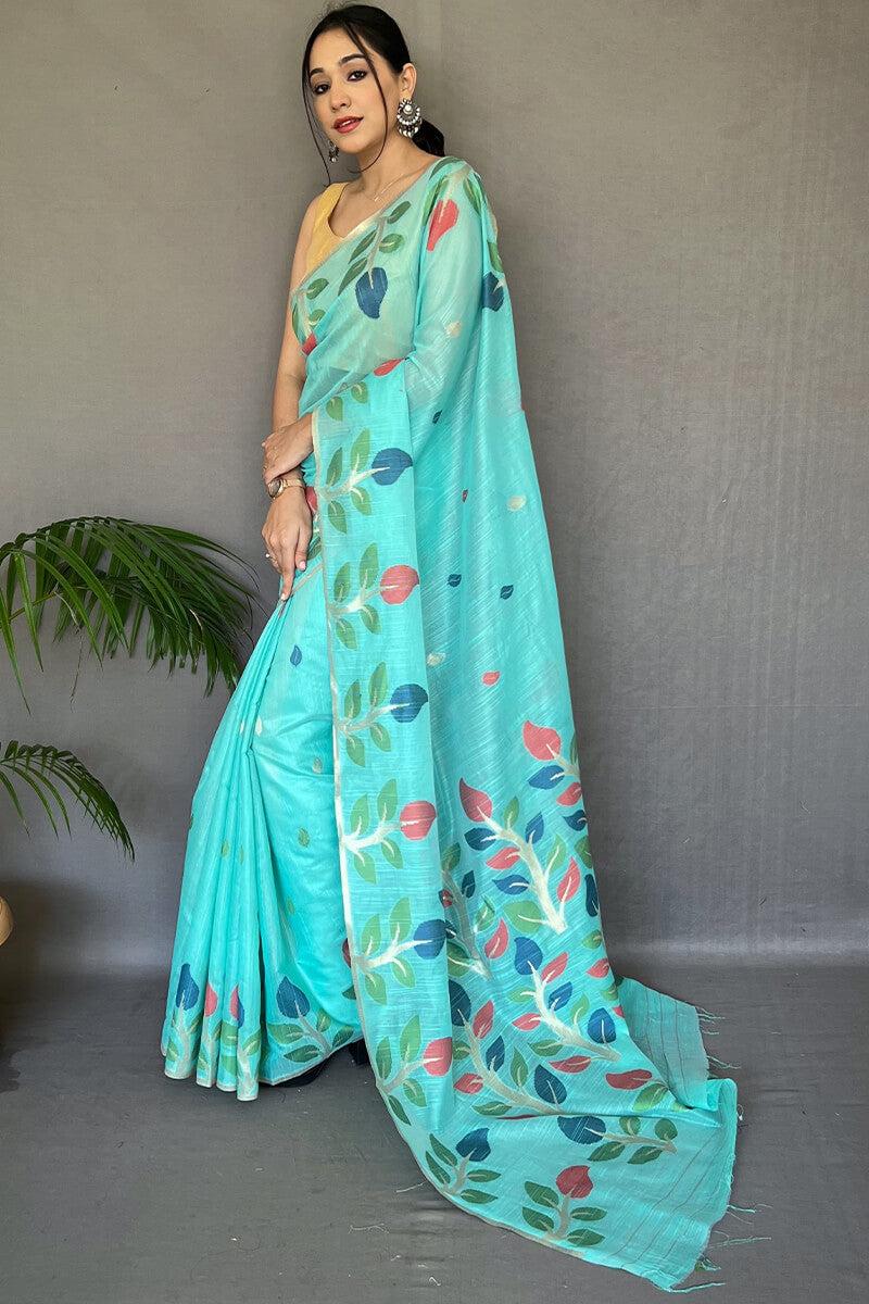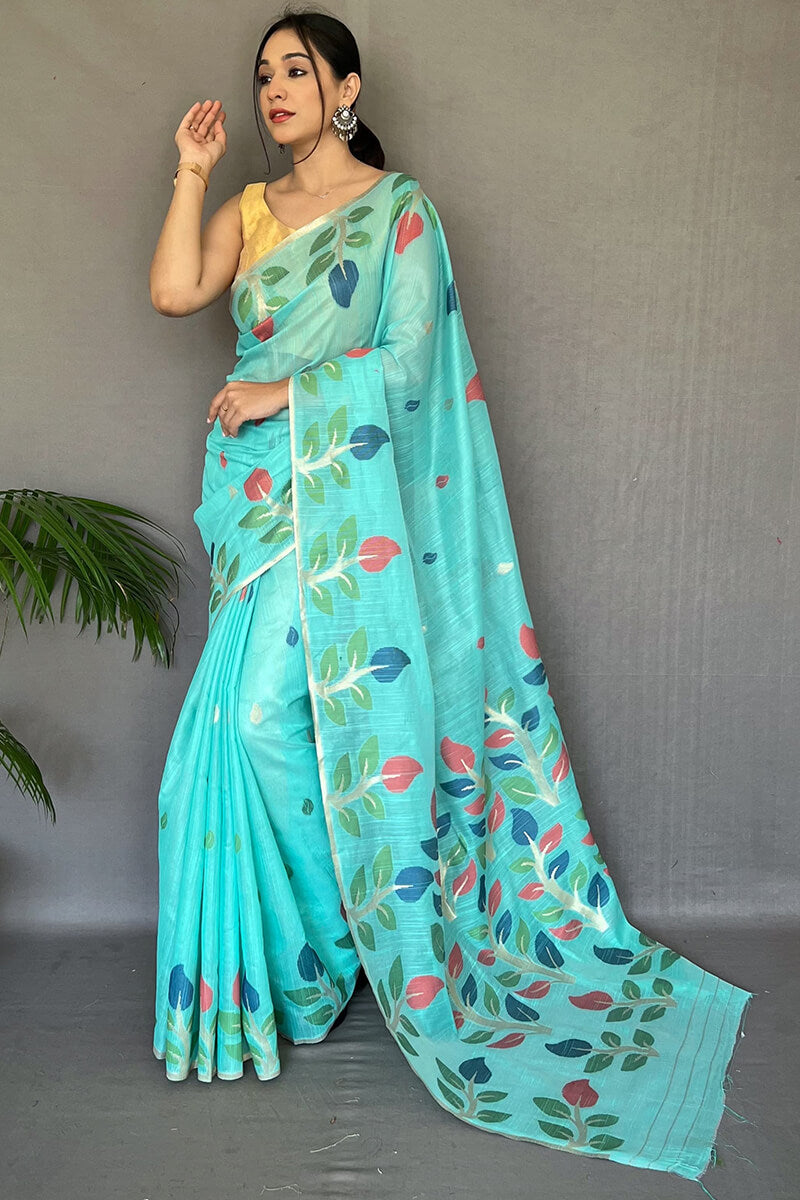 Dive into the serene beauty of the Aquamarine Blue Linen Silk Saree, a masterpiece that captures the essence of tranquility and grace. The vibrant blue hue, reminiscent of clear ocean waters, creates a striking visual appeal. Crafted from a blend of linen and silk, this saree offers the perfect balance of comfort and elegance. Its fluid drape and lustrous finish make it suitable for both festive occasions and formal events