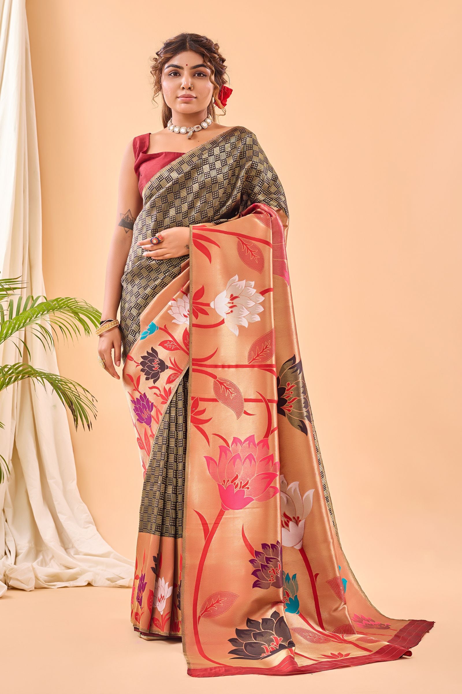 Dark Beige Kashmiri Soft Cotton Pashmina Silk Saree with Floral Print