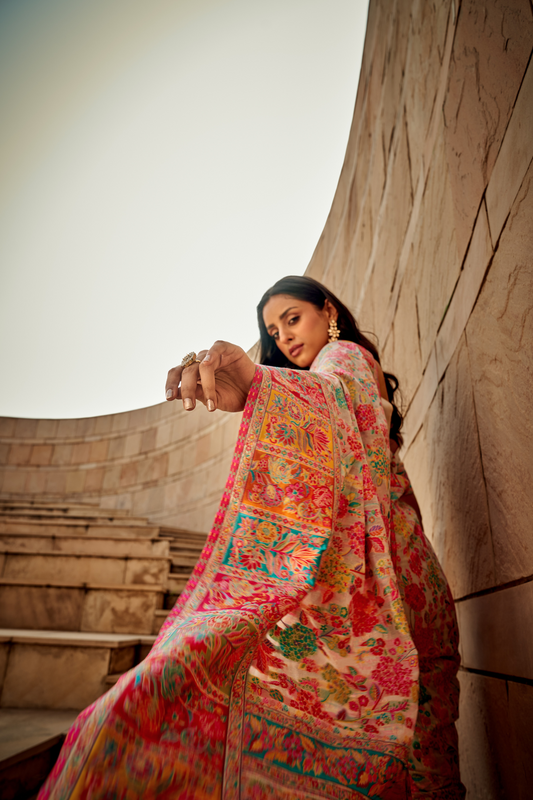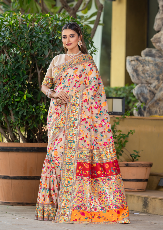 Cream Cotton Silk Pashmina Sarees with Kashmiri Modal Weaving