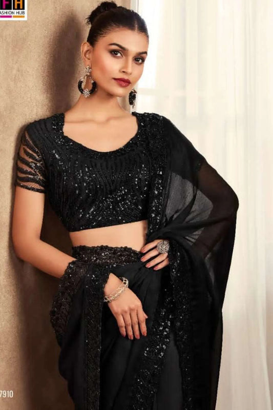 Black Designer Soft Silk Chiffon Saree With Fancy Work