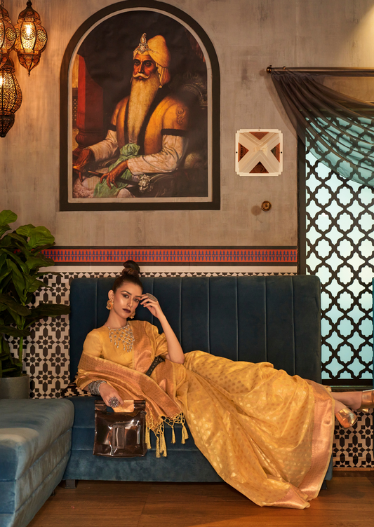 Golden Yellow Banarasi Tissue Woven Silk Saree with Copper Zari