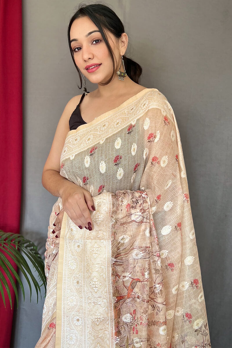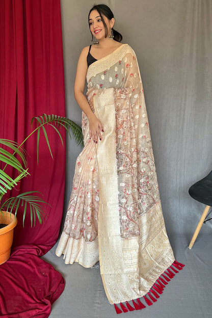Dark Beige Kashmiri Soft Cotton Pashmina Silk Saree with Floral Print