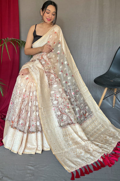 Cream Cotton Silk Pashmina Sarees with Kashmiri Modal Weaving