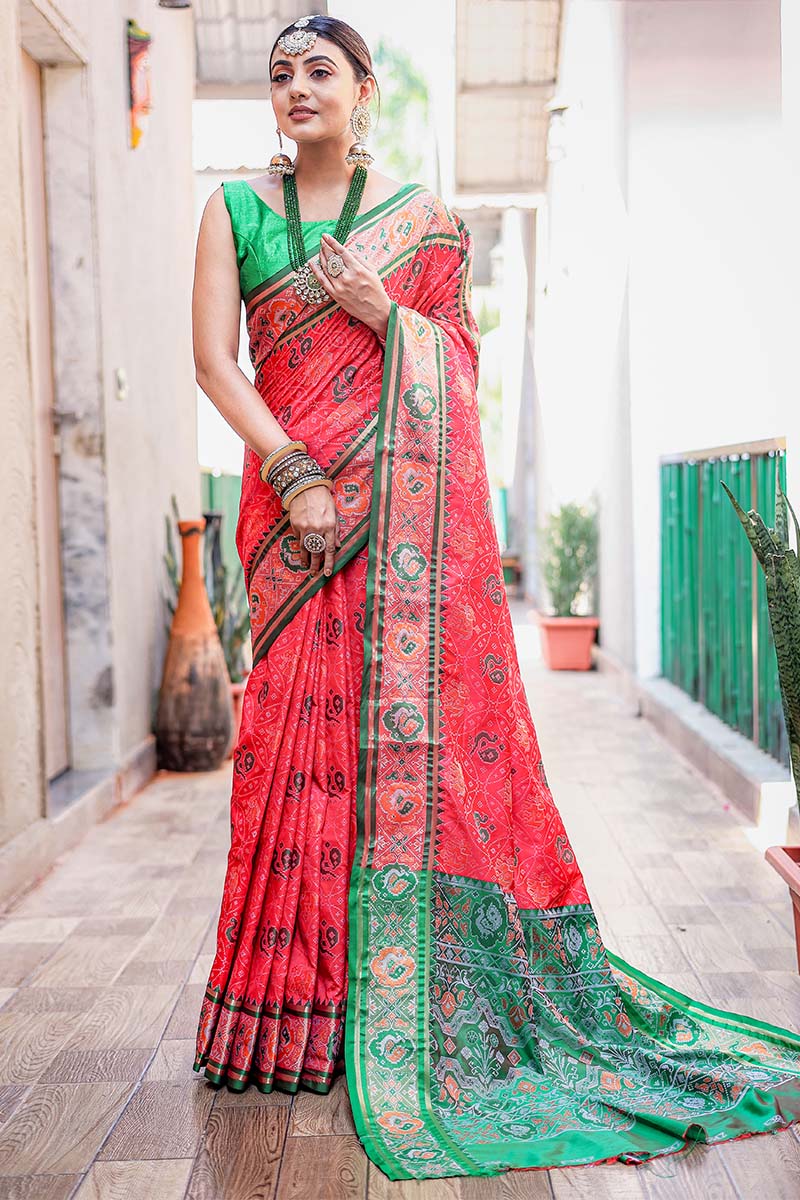 Envelop yourself in the ethereal elegance of this Carmine Pink Zari Woven Patola Silk Saree. Crafted with finesse and adorned with intricate zari work, this saree embodies timeless grace and sophistication. The rich carmine pink hue adds a touch of regal charm, making it perfect for special occasions and festivities.