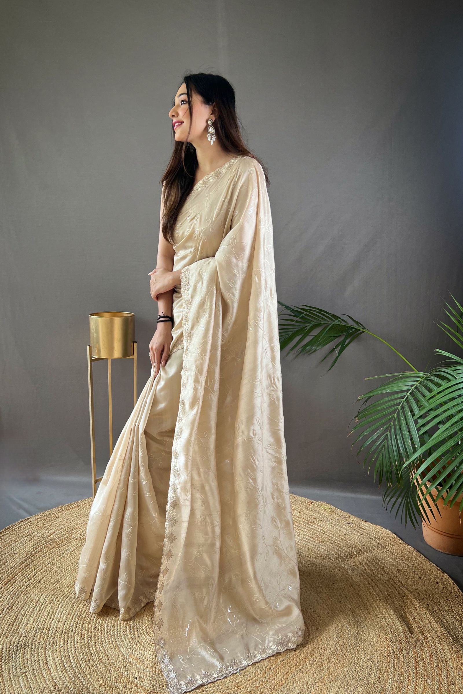 Chickoo Sequins Work Silk Saree with Embroidered Border