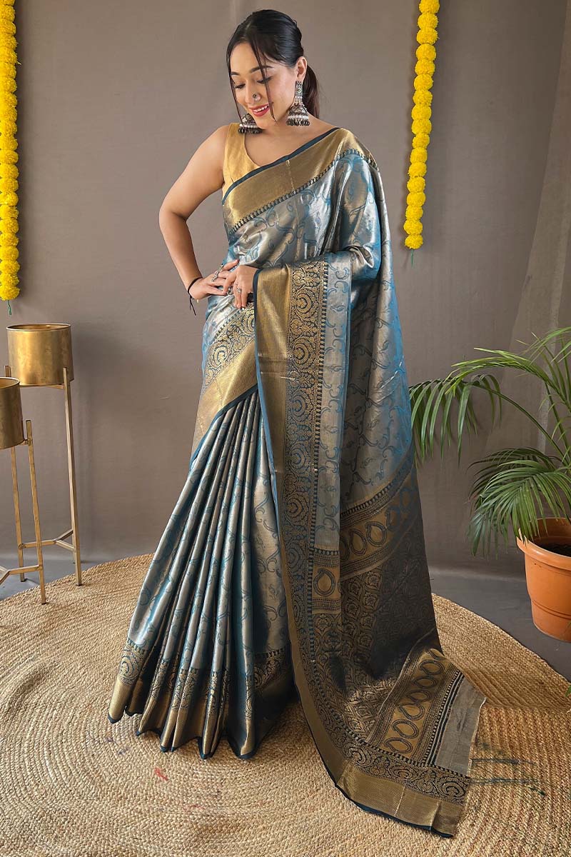 Dark Grey Blue Kanjivaram Silk Saree