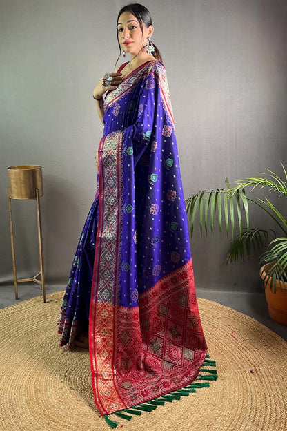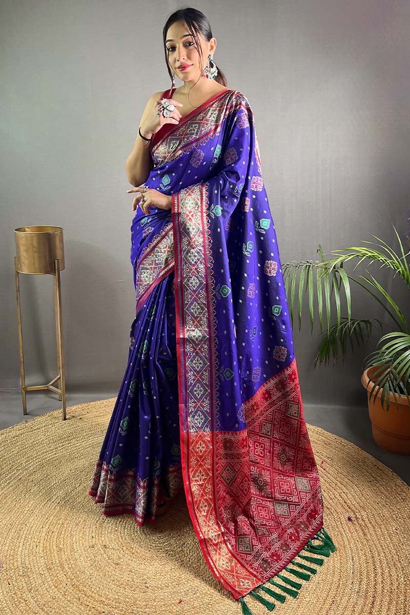 Channel timeless elegance with the Indigo Blue Patola Silk Saree. A symbol of sophistication and grace, this saree boasts a classic hue that transcends trends. The deep indigo color exudes a sense of mystery and allure, while the intricate patola weave adds a touch of traditional charm.