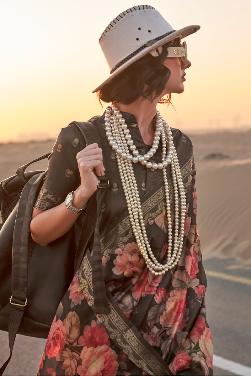 Irish Black Printed Tussar Silk Saree