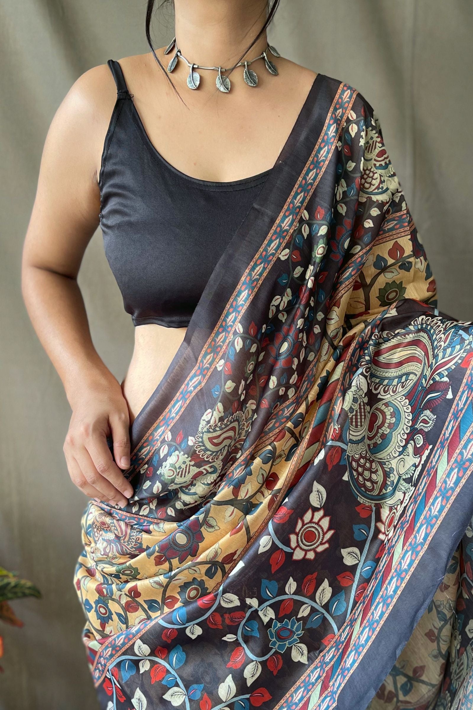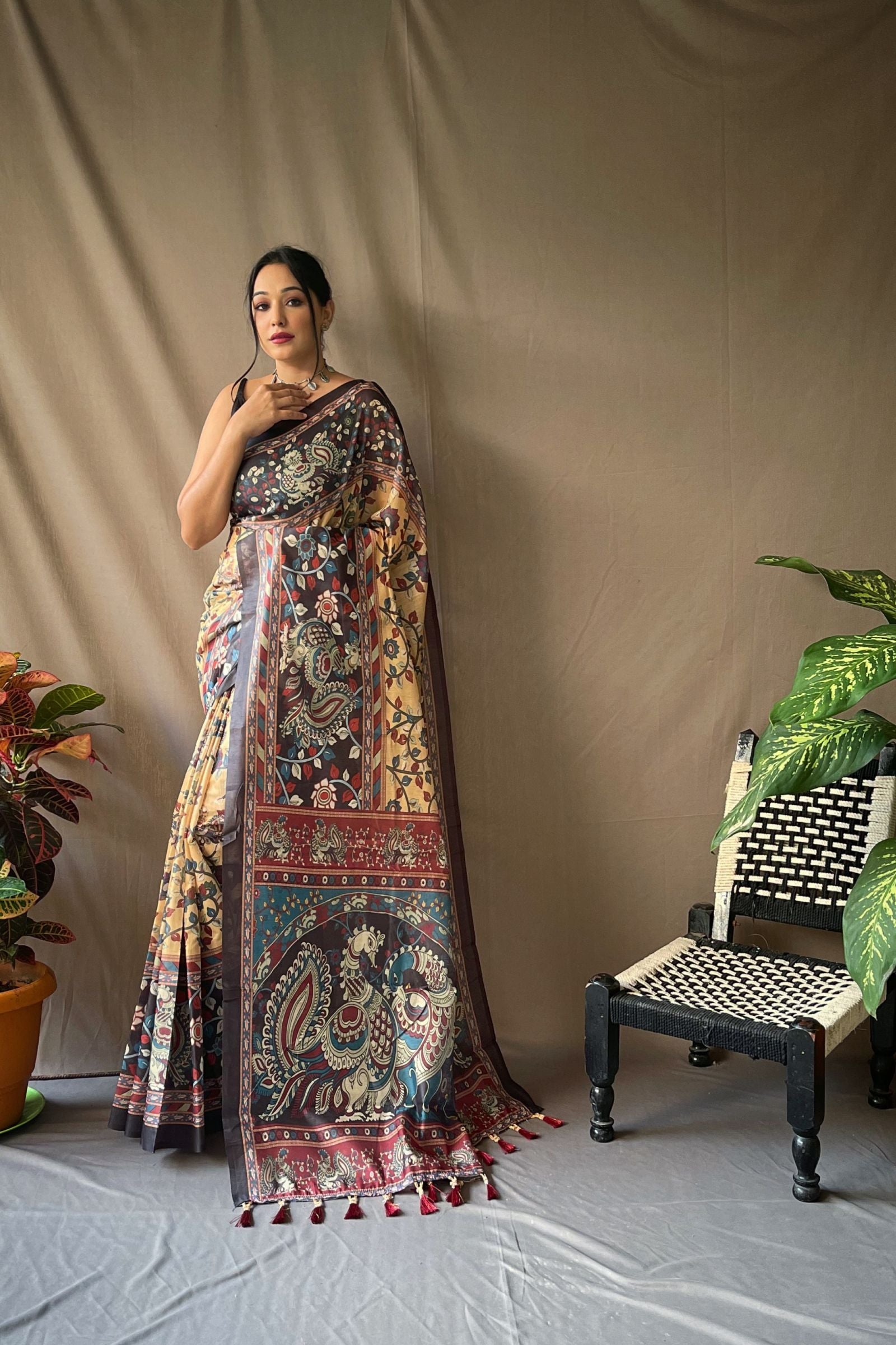Carry a classy traditional look by draping a subtle yet pretty soft Cotton saree by Glam Rani that emphasizes mesmerizing Kalamkari digital prints throughout. Fabricated with the finest pure soft cotton, this saree features contrast printed border and pallu along with lovely tassels to exude grace. Add a touch of sophistication to your wardrobe.