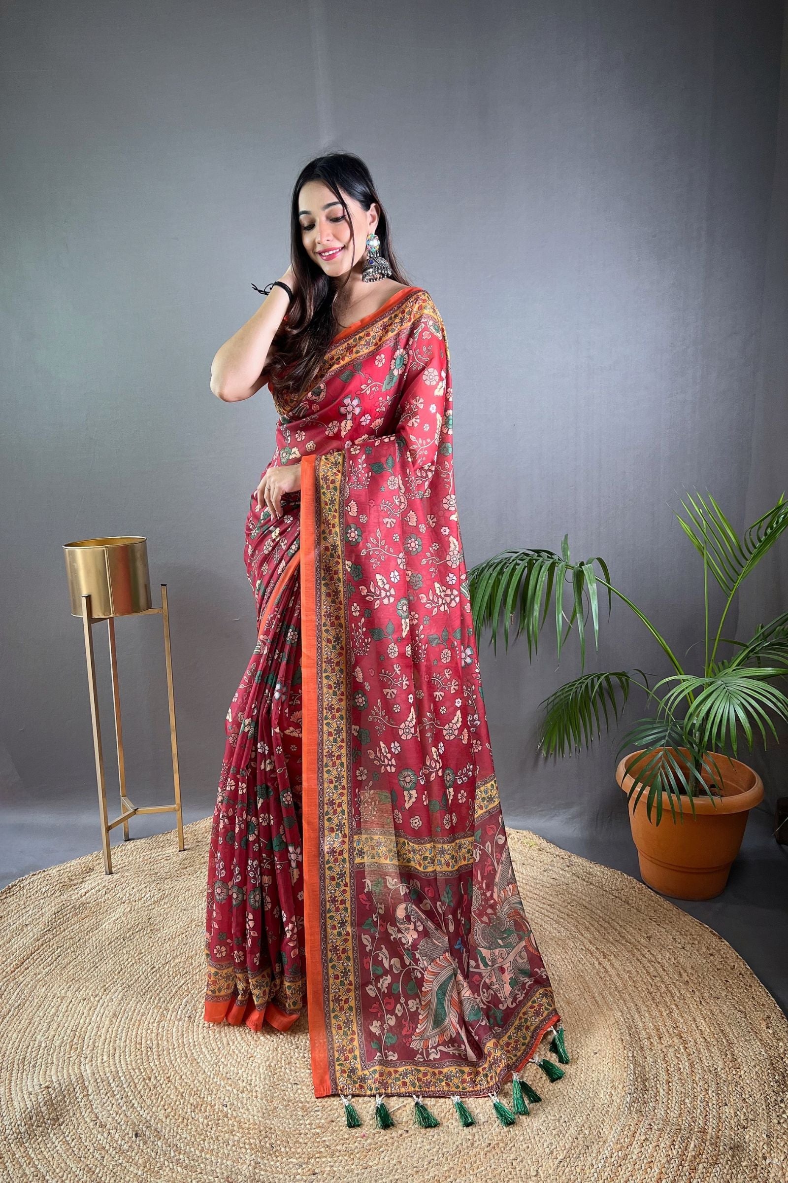 Carry a classy traditional look by draping a subtle yet pretty Malai Cotton saree by Glam Rani that emphasizes mesmerizing Kalamkari prints throughout. Fabricated with pure malai cotton, this saree features contrast colored border along with lovely tassels to exude grace. Add a touch of sophistication to your wardrobe.