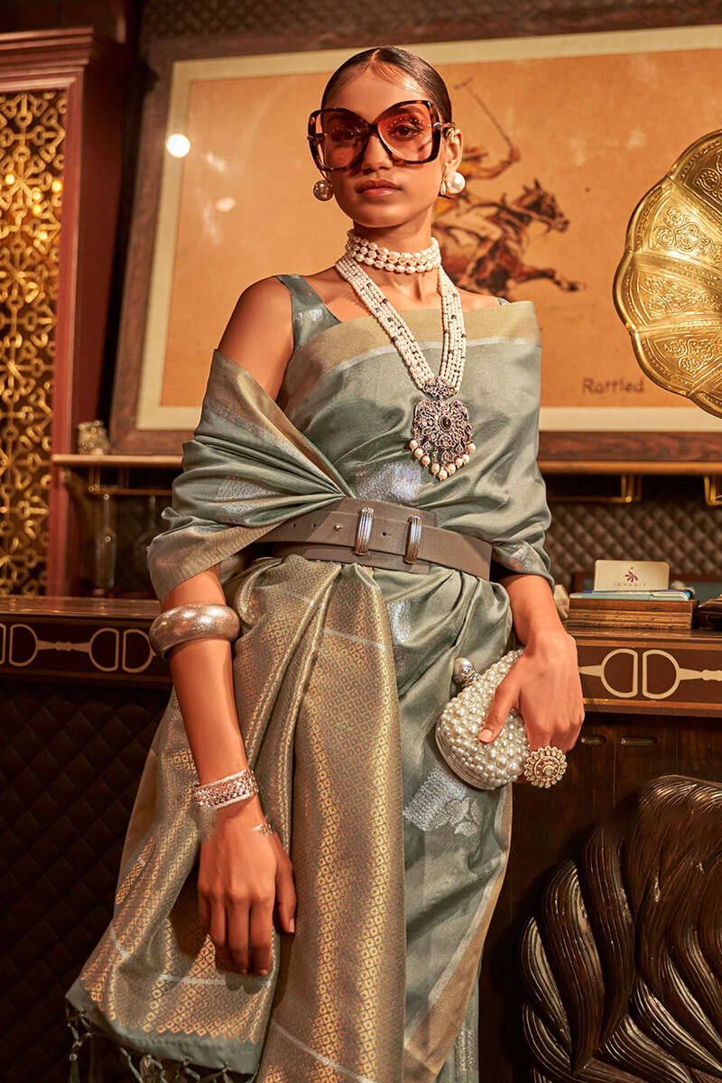 Olive Grey Copper zari Woven Banarasi Silk Saree