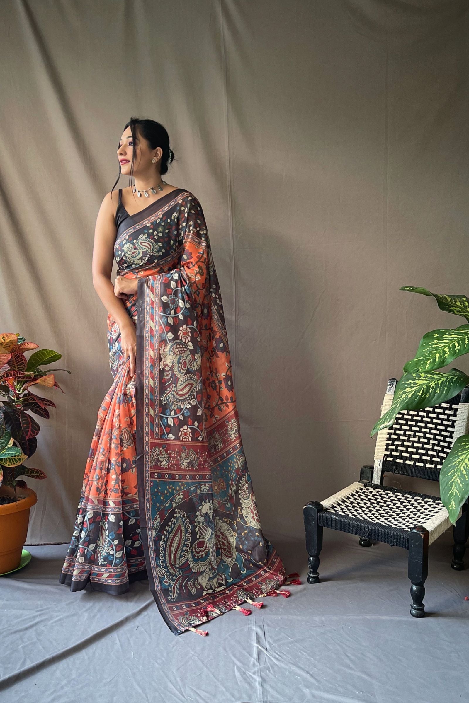 Orange Kalamkari Digital Printed Soft Cotton Saree
