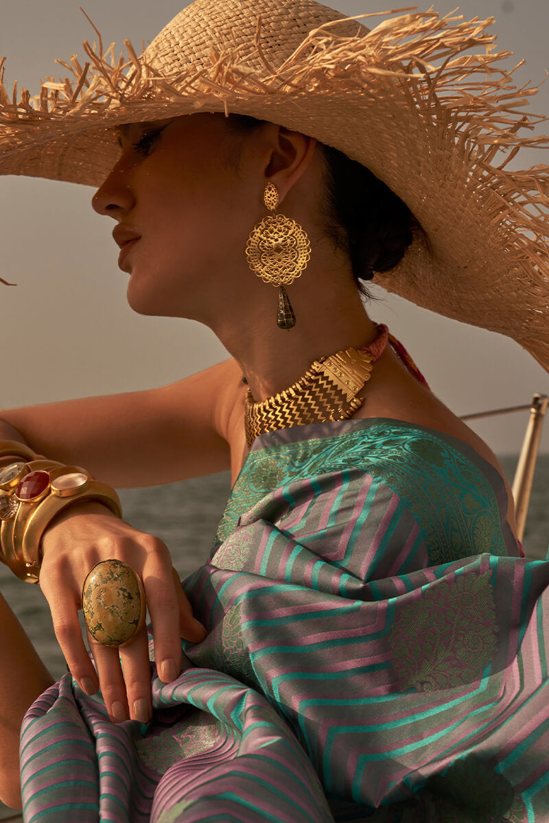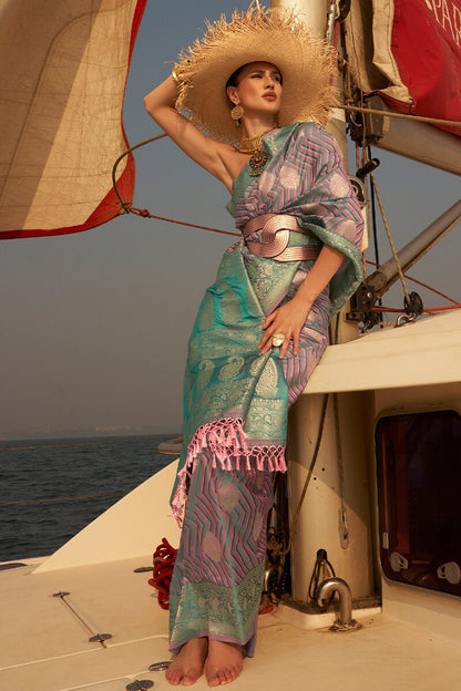 Pink and Green Two Tone Banarasi Satin Silk Saree