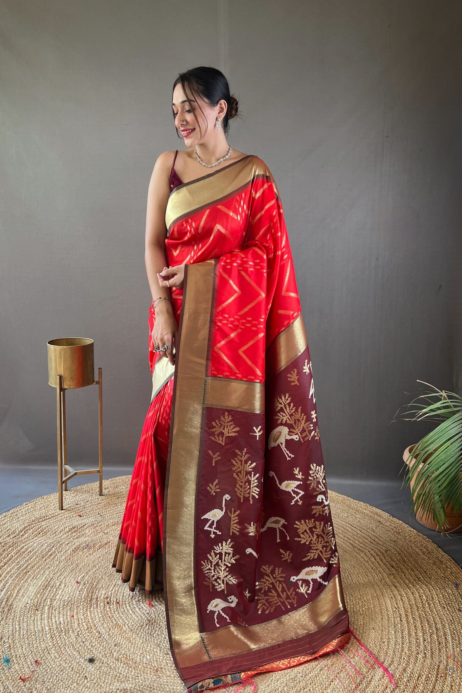 The gorgeous saree at Glam Rani features captivating zigzag design that is woven with the finest zari yarn. Crafted with flawless soft silk fabric, this saree showcases beautiful artwork on the pallu and luxurious zari border making it a perfect party wear outfit. Elevate your wardrobe with this timeless piece.