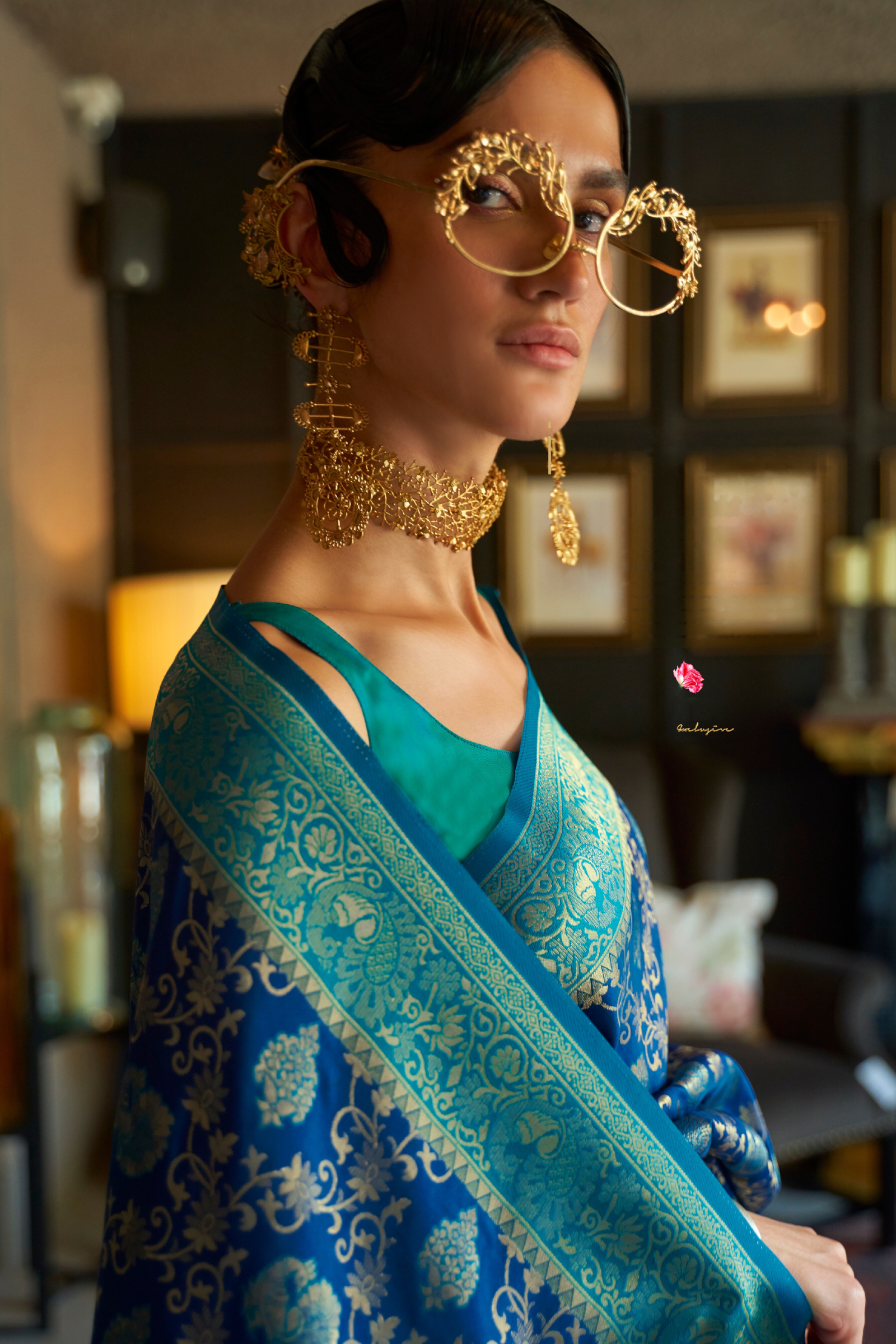 Expertly handwoven with pure Banarasi Katan silk, Glam Rani Royal Blue saree is a true masterpiece. The intricate handloom weaving adds a touch of elegance to this traditional garment. Reveal your unique sense of style and indulge in the luxurious comfort of this saree.