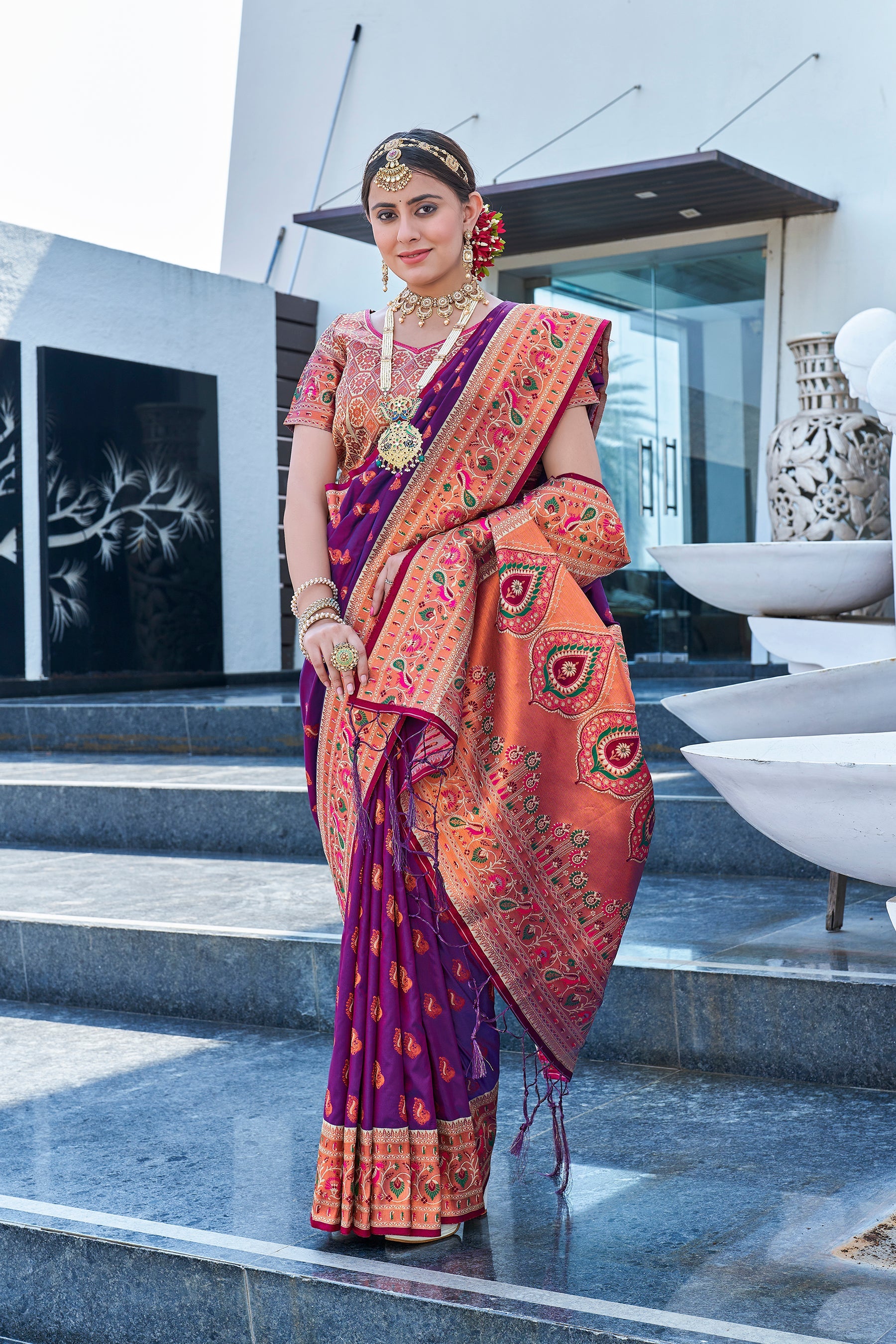 Royal Purple Original Maharashtrian Meenakari Paithani Silk Zari Woven Saree