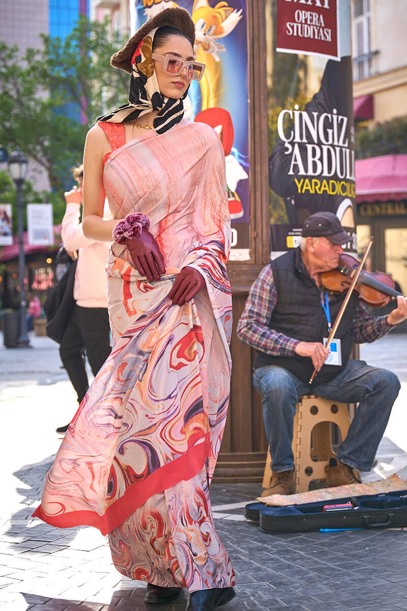 Soft Pink Digital Printed Satin Silk Saree
