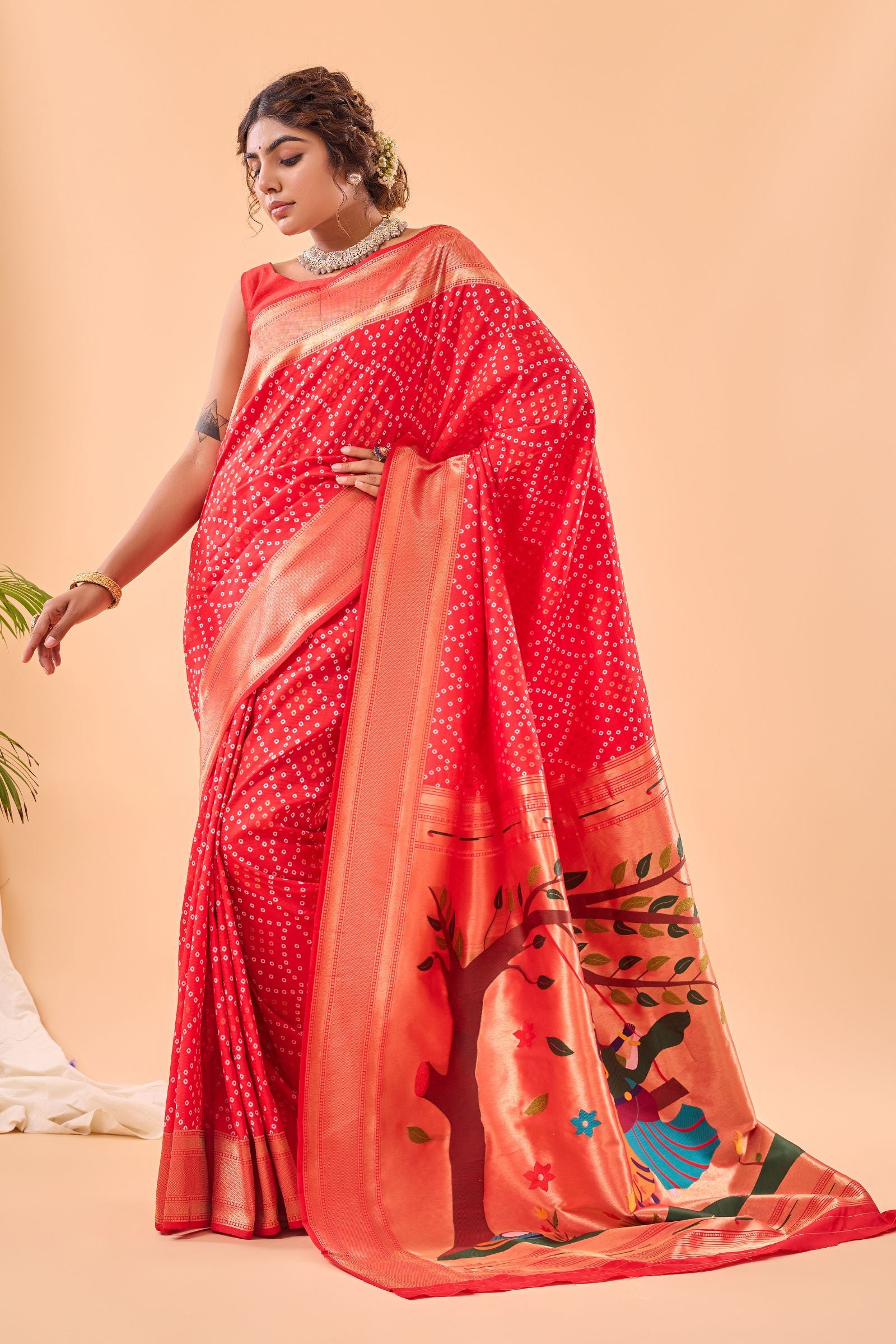 Tomato Red Bandhani Weaving Paithani Silk Saree