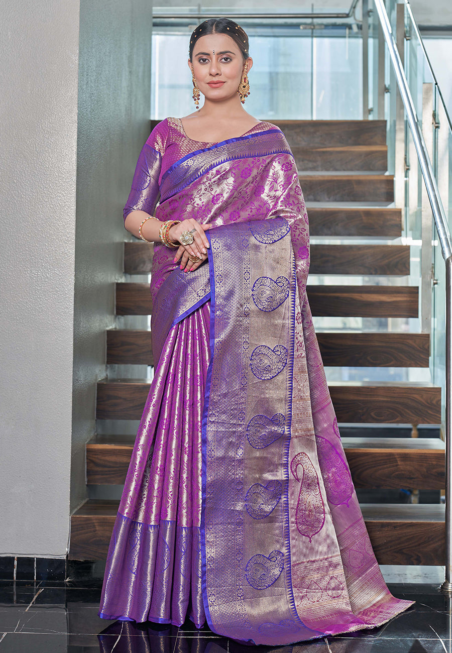 Warm Purple Kanchipuram Silk Jaal Traditional Rich Zari Woven Saree